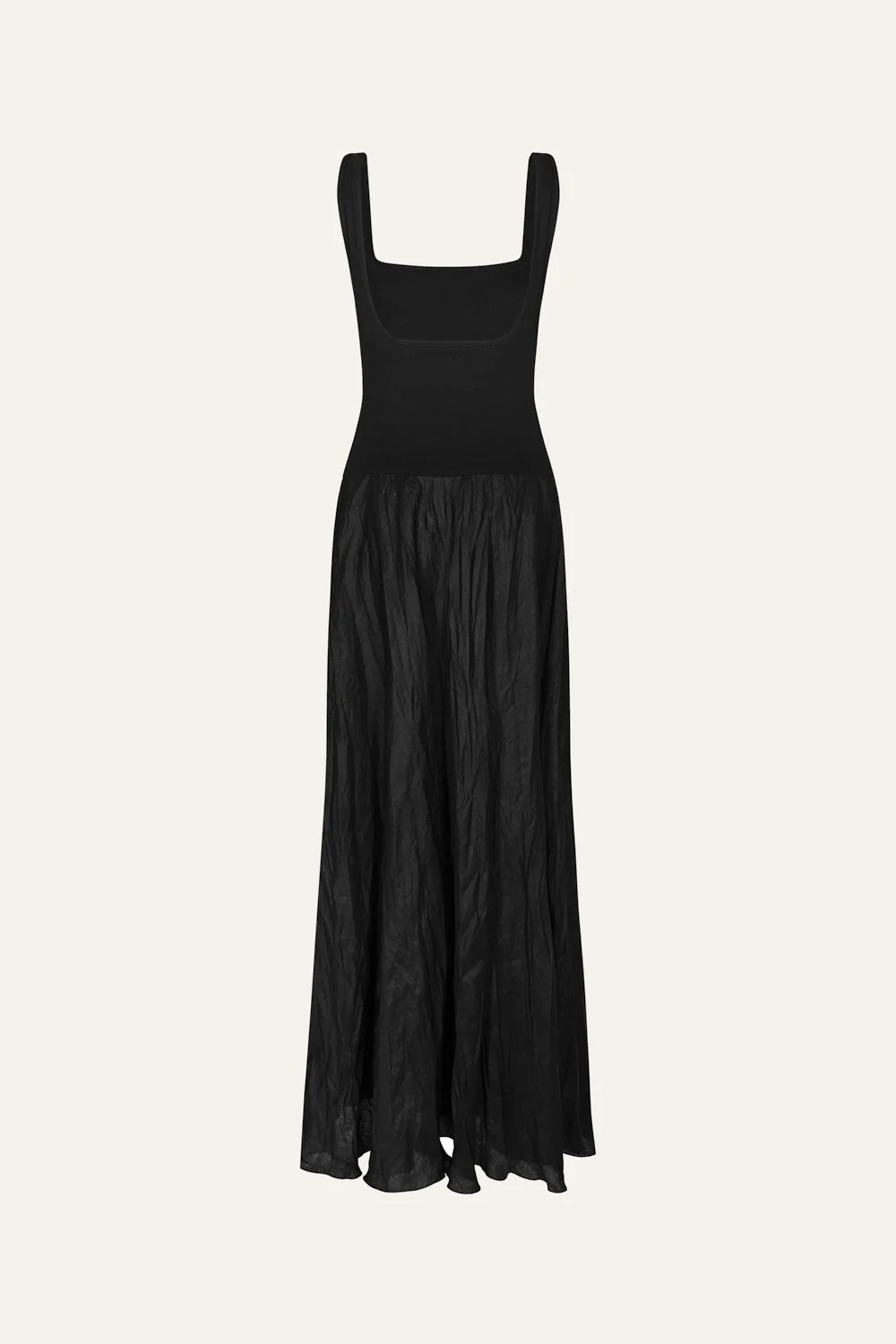 A maxi-length dress crafted from a soft linen-cotton blend with a ribbed texture. Featuring a squared neckline and a flowing silhouette, it’s designed for effortless movement and versatile styling.