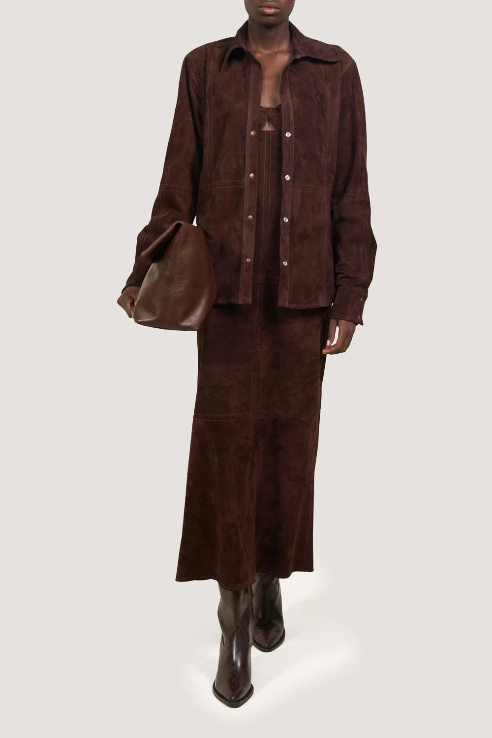 A classic silhouette reinterpreted in smooth leather, this shirt adds structure and depth to seasonal styling. Wear it open over dresses or buttoned up with tailored pieces to introduce contrast and texture.