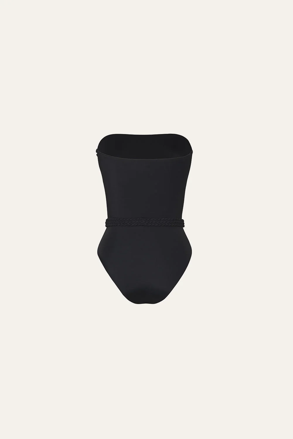 A sleek strapless one-piece swimsuit in classic black. Featuring a braided belt with shell detailing at the waist, it offers a unique Johanna Ortiz touch.