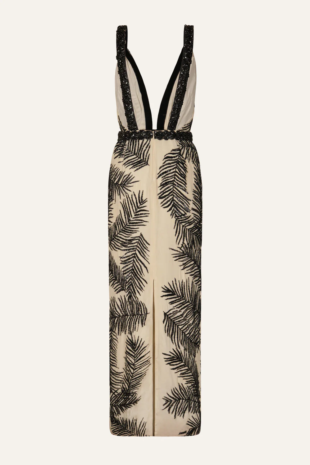 Styling Notes: This ankle-length dress features a V-neck design with deep cleavage and thick straps for a bold, confident look. Beautiful embroidered leaves and elegant intricate black embroidery accentuate the waist and neckline. This dress combines elegance with striking detail, creating a memorable statement piece.